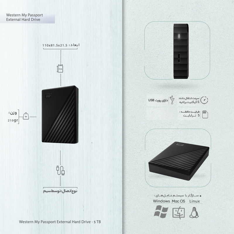 هارددیسک «My Passport» محصولی از شرکت «وسترن دیجیتال» یا همان WD است که در گروه هارددیسکهای اکسترنال قابل حمل قرار میگیرد. این هارددیسک از طریق رابط USB3.0 به رایانه متصل میشود و میتواند اطلاعات را با سرعت زیاد انتقال دهد. سایز هد ارایه شده روی این محصول 2.5 اینچ بوده که سایز استاندارد برای هاردهای اکسترنال محسوب میشود. طراحی این هارد بهگونهای است که هنگام در دست گرفتنش سادگی منحصر به فرد آن هر سلیقهای را راضی میکند. ظرفیت 5 ترابایتی این هارددیسک برای افرادی که اطلاعات زیادی برای ذخیرهسازی دارند، مناسب است. ابعاد بسیار کوچک و وزن مناسب My Passport باعث شده که به راحتی بتوان همیشه آنرا با خود همراه داشت. اگر قصد تهیهی یک هارددیسک ساده را دارید، My Passport میتواند انتخاب مناسبی برای شما باشد. یکی از ویژگیهای این مدل رنگبندی آن است. شما میتوانید این محصول را در 3 رنگ مشکی، قرمز و آبی تهیه کنید. برای افرادی که هاردهای زیادی دارند، استفاده از رنگ بندی برای تفکیک هارد کارایی دارد.