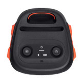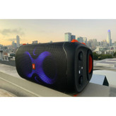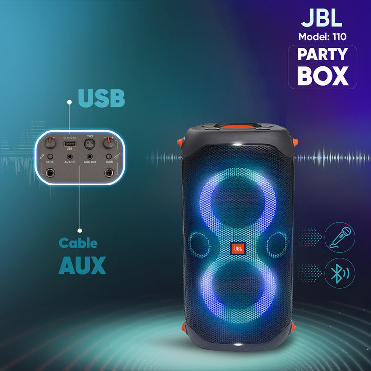 با اسپیکر قدرتمند و قابل حمل JBL PartyBox 110 میتوانید مهمانی را با صدای قدرتمند و نمایش نور پویا شروع کنید. این دستگاه با نورپردازی منحصر به فرد LED هماهنگ شده، با صدای قدرتمند و باس عمیق، برای هر مهمانی، محتوای جدیدی به ارمغان میآورد. اسپیکر JBL PartyBox 110 دارای یک طراحی جمع و جور است که میتوان آن را با یک دست حمل کرد. همراه با صدای با کیفیت JBL Original Pro با ظرفیت قدرت 160 وات با پاسخ فرکانس 45 هرتز تا 20 کیلوهرتز و حساسیت 6 دسی بل همراه است که مجموعه ای از فن آوریهای پیشرفته مانند بلوتوث 5.1 را در خود دارد. اسپیکرهای JBL PartyBox 110 یک اسپیکر بلوتوثی با چراغهای LED زیبا و سیستم ارتقا یافته مدل قبلی این برند است که به فضای بیشتر، مانند یک اثر هنری زیباتر، همراه با دو توییتر و دو ووفر مجهز شده اند. این دستگاه مجموعاً دارای 4 چراغ ، به همراه 2 چراغ چشمک زن در بالا و پایین برای دنبال کردن موسیقی است. به راستی JBL PartyBox 110 به شما تجربه سمعی و بصری بی نظیر و همه جانبه ای میبخشد که هر مهمانی را به یک اثر هنری تبدیل میکند. هر نوع موسیقی با نمایش نور پویا بهتر است. نمایش نور پویا که با ضربان همگام سازی میشود، رنگهای همگام با ضربات را به حرکت در میآورد، در حالی که استروبها و الگوهای قابل تنظیم چشمان شما را خیره میکند. این یک تجربه شنیداری و بصری منحصر به فرد است که هر مهمانی را به یک اثر هنری تبدیل مینماید. همچنین میتوانید مهمانی را تمام روز تأمین کنید. با 12 ساعت دوام باتری قابل شارژ داخلی، پخش ادامه خواهد یافت. ضمن آنکه با درجه مقاومت IPX4 میتوانید آن را در کنار استخر با خود همراه کنید. JBL PartyBox 110 به دلیل دارا بودن گواهینامه IPX4 مقاوم در برابر آب است، بنابراین هرگز نگران خیس شدن و آسیب دیدن آن نخواهید بود. از سویی دیگر، با ورودیهای میکروفون و گیتار، میتوانید استعدادهای خود را هنگام آواز خواندن و بازی نشان دهید.