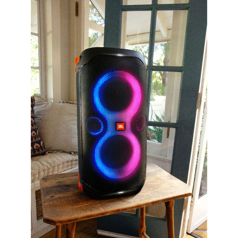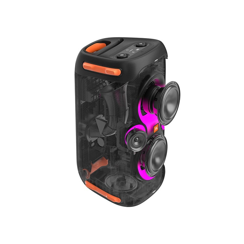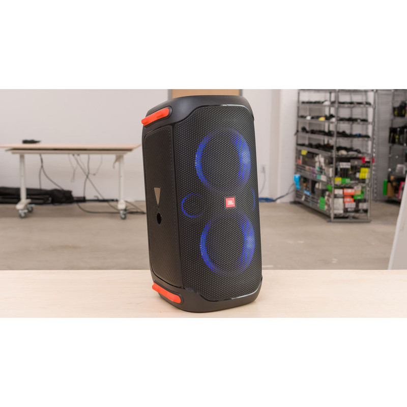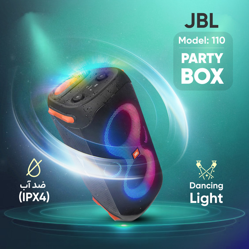 با اسپیکر قدرتمند و قابل حمل JBL PartyBox 110 میتوانید مهمانی را با صدای قدرتمند و نمایش نور پویا شروع کنید. این دستگاه با نورپردازی منحصر به فرد LED هماهنگ شده، با صدای قدرتمند و باس عمیق، برای هر مهمانی، محتوای جدیدی به ارمغان میآورد. اسپیکر JBL PartyBox 110 دارای یک طراحی جمع و جور است که میتوان آن را با یک دست حمل کرد. همراه با صدای با کیفیت JBL Original Pro با ظرفیت قدرت 160 وات با پاسخ فرکانس 45 هرتز تا 20 کیلوهرتز و حساسیت 6 دسی بل همراه است که مجموعه ای از فن آوریهای پیشرفته مانند بلوتوث 5.1 را در خود دارد. اسپیکرهای JBL PartyBox 110 یک اسپیکر بلوتوثی با چراغهای LED زیبا و سیستم ارتقا یافته مدل قبلی این برند است که به فضای بیشتر، مانند یک اثر هنری زیباتر، همراه با دو توییتر و دو ووفر مجهز شده اند. این دستگاه مجموعاً دارای 4 چراغ ، به همراه 2 چراغ چشمک زن در بالا و پایین برای دنبال کردن موسیقی است. به راستی JBL PartyBox 110 به شما تجربه سمعی و بصری بی نظیر و همه جانبه ای میبخشد که هر مهمانی را به یک اثر هنری تبدیل میکند. هر نوع موسیقی با نمایش نور پویا بهتر است. نمایش نور پویا که با ضربان همگام سازی میشود، رنگهای همگام با ضربات را به حرکت در میآورد، در حالی که استروبها و الگوهای قابل تنظیم چشمان شما را خیره میکند. این یک تجربه شنیداری و بصری منحصر به فرد است که هر مهمانی را به یک اثر هنری تبدیل مینماید. همچنین میتوانید مهمانی را تمام روز تأمین کنید. با 12 ساعت دوام باتری قابل شارژ داخلی، پخش ادامه خواهد یافت. ضمن آنکه با درجه مقاومت IPX4 میتوانید آن را در کنار استخر با خود همراه کنید. JBL PartyBox 110 به دلیل دارا بودن گواهینامه IPX4 مقاوم در برابر آب است، بنابراین هرگز نگران خیس شدن و آسیب دیدن آن نخواهید بود. از سویی دیگر، با ورودیهای میکروفون و گیتار، میتوانید استعدادهای خود را هنگام آواز خواندن و بازی نشان دهید.