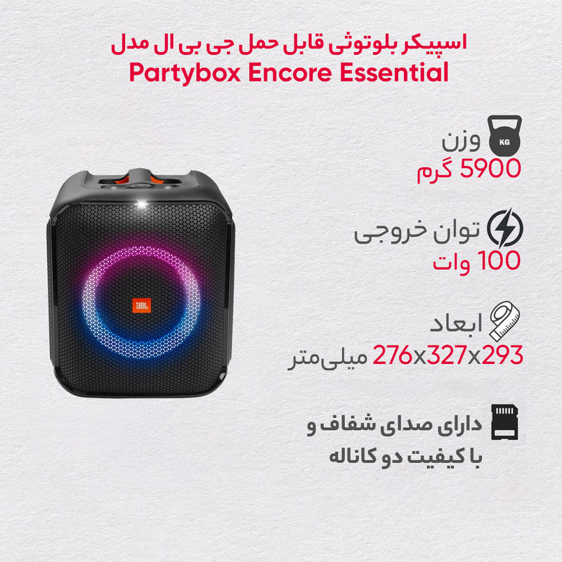 اسپیکر جدید jBL با نام JBL PartyBox Encore؛ اسپیکری بسیار قدرتمند و قابلحمل است. کاملا ضد آب و امکان استفاده در کنار استخر یا ساحل را دارد. این اسپیکر از خانواده partyBox جیبیال محسوب میشود و دارای توان خروجی 100 وات واقعی است که در یک حجم کوچک این عملکرد صدای وسیع و بالا را دارد و مانند مدلهای دیگر خود در حالتی که داخل برق است، صدای بیشتری دارد. اسپیکر jbl partybox encore دارای باتری با توان پخش 6 ساعت به صورت مداوم است که بسیار کارآمد برای حملونقل است. گفتنی است باتری این اسپیکر تنها در 1.5 ساعت شارژ میشود. برخی از قابلیتهای این اسپیکر، اتصال 2 اسپیکر به یکدیگر Stereo، سازگاری با نرمافزار JBL Partybox، قابلیت اتصال بیسیم بلوتوث، قابلیت اتصال USB و کابل Aux، داشتن گواهینامه مقاوم در برابر آب IPX4، توان خروجی 100 وات واقعی و اتصال بلوتوث نسخه 5.1 برای حملونقل است. باتری این اسپیکر تنها در 1.5 ساعت شارژ میشود.