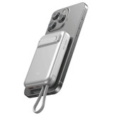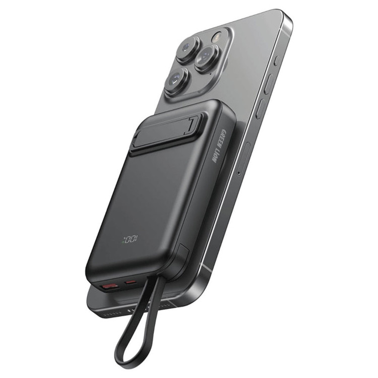 این پاوربانک به آهنربای نئودیمیوم فوق العاده قوی مجهز شده است که به دستگاه شما محکم می چسبد و می تواند هم موبایل را با کابل شارژ کند و هم موبایل هایی که دارای قابلیت شارژ بی سیم هستند رو به صورت وایرلس شارژ کند، همین طور این دستگاه دارای ویژگی آهنربایی یا مگسیف برای موبایل های آیفون 12 به بالا است و آنها را در این حالت شارژ می کند. لازم به ذکر است که این محصول دارای درگاه تایپ سی می باشد و ولتاژ و شدت جریان ورودی آن که برای شارژ کردن این کالا مناسب است، 18 وات بوده و این نکته مهم است که با شارژر مناسب آن را شارژ کنید که با این ورودی ها متناسب باشد. توان خروجی شارژ وایرلس آن تا حداکثر 15 وات و توان خروجی درگاه یو اس بی 22.5 وات، خروجی تایپ سی از تکنولوژی شارژ PD با توان 20 وات پشتیبانی می کند.